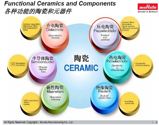 “新的電子設(shè)備要由新的電子元器件來構(gòu)成,而新的電子元器件又要用新的原材料來制造,將所需的功能,始終回歸到材料是村田制作所創(chuàng)業(yè)以來始終不變的基本理念。我們?yōu)檫@次論壇帶來的也是一種與眾不同的原材料——壓電陶瓷。”村田制作所產(chǎn)品經(jīng)理陳明在PCF2009上表示,壓電陶瓷材料有許多先天優(yōu)勢,如相比普通晶振,采用壓電陶瓷材料的震蕩子具有體積小、起振快、強度高、可以內(nèi)藏電容器等多種優(yōu)勢。現(xiàn)在通過村田的不斷努力,采用壓電陶瓷材料的電子元件在電子產(chǎn)品中應(yīng)用已經(jīng)十分廣泛(如陶瓷濾波器、陶瓷震蕩子以及壓電蜂鳴器等元件已經(jīng)得到了汽車、手機、微處理器等市場的廣泛應(yīng)用)。