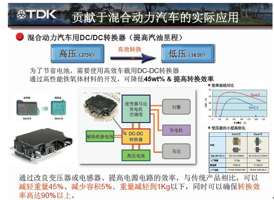 各種功能的陶瓷和元器件 除了進行原材料上的創(chuàng)新,開發(fā)產(chǎn)品時也需要注意環(huán)境的保護,TDK-EPC株式會社電子零部件營業(yè)Grp市場統(tǒng)括部、市場領(lǐng)域戰(zhàn)略部部長中井信也在PCF2009上介紹,要從國際性經(jīng)濟危機中突圍,就要創(chuàng)造新的價值,因此TDK進行了大規(guī)模的事業(yè)創(chuàng)建,將“以『環(huán)境』作為切入口,以達到“開創(chuàng)新型主力產(chǎn)品”和“擴大經(jīng)營”的目的。”在同期舉辦的高交會電子展中,TDK還以“地球環(huán)境保護”為主題,展出了豐富的綠色環(huán)保電子元器件與EMC整體解決方案。中井信也表示,通過新材料的研發(fā),TDK在電容、傳感器、變壓器等產(chǎn)品的綠色化進程中都取得了不小成就,如“在汽車用DC/DC轉(zhuǎn)換器中,通過采用TDK改良材料的變壓器或電感器,可以有效提高電源電路的效率,而且與傳統(tǒng)產(chǎn)品相比,可以減輕重量45%、減少容積5%、重量減輕到1Kg以下,同時可以確保轉(zhuǎn)換效率高達90%以上。”
