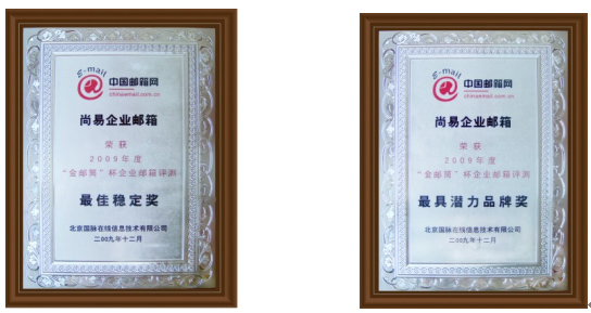 據(jù)網(wǎng)易科技頻道消息,中國郵箱網(wǎng)在2009年年底主辦了“金郵筒”杯企業(yè)郵箱評測,該評測共評選出了最佳技術(shù)創(chuàng)新、最佳穩(wěn)定等6大獎(jiǎng)項(xiàng),尚易作為國內(nèi)專業(yè)級企業(yè)郵箱就獨(dú)攬了兩大獎(jiǎng)項(xiàng)“最佳穩(wěn)定獎(jiǎng)”和“最具潛力品牌獎(jiǎng)”。