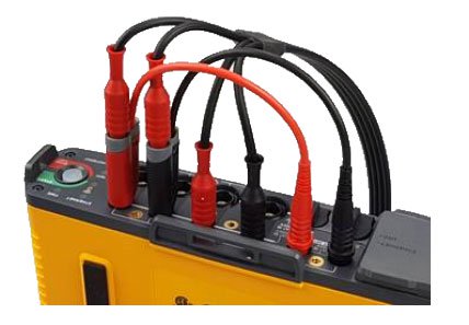 請謹(jǐn)慎操作,避免任何上述錯誤的接線配置。 福祿克強烈建議您停止使用“Voltage Test Lead, 3-phase + N”(電壓測試線,3相+ N)電纜組,并聯(lián)系福祿克免費更換測試線套件。替換測試線套件采用直插式香蕉連接器,而非可堆疊連接器。 為了便于從測量端子為記錄儀供電,替換測試線套件還包含帶有可堆疊連接器和直插式香蕉連接器的短跳線附件。這種替換測試線套件配置避免了端子連接錯誤的可能性。請參見下圖。 替換測試線組已安裝。