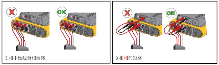 福祿克已確定,如果173x系列、174x系列電能質(zhì)量記錄儀和3540FC功率監(jiān)測儀標(biāo)配的電壓測試線組3PHVL-1730或3PHVL-1730-5M “Voltage Test Lead, 3-phase + N”(電壓測試線,3相+ N)使用不當(dāng),可能會使用戶暴露于危險環(huán)境之中,造成嚴(yán)重人身傷害或儀器損壞。 雖然上述測試線組本身符合適用的安全標(biāo)準(zhǔn)要求,但將其連接至記錄儀時,用戶可能會錯誤連接測試線組上的電壓連接。請參見下面的[照片/圖示],直觀地了解接線錯誤情況。 雖然對于訓(xùn)練有素的專業(yè)人員來說,下圖所示接線錯誤可能顯而易見,但一旦發(fā)生這種接線錯誤,則可能會導(dǎo)致相間或相至中性線短路,有可能導(dǎo)致電弧爆炸,造成嚴(yán)重人身傷害或儀器損壞風(fēng)險。 可能導(dǎo)致短路的錯誤電壓連接示例(錯誤情況以紅色X表示): 174X系列錯誤的3相測試線連接