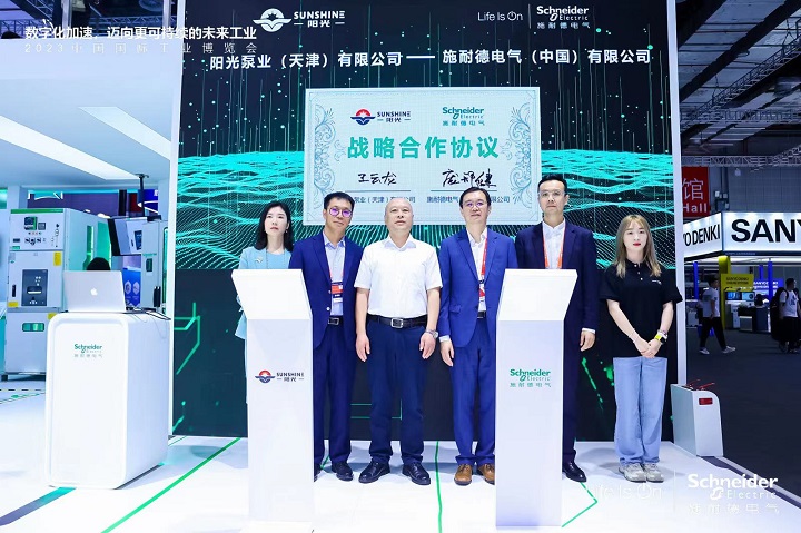 今天,在2023年第23屆中國國際工業(yè)博覽會現(xiàn)場,全球能源管理和自動化領域的數(shù)字化轉(zhuǎn)型專家施耐德電氣,與陽光泵業(yè)(天津)有限公司(以下簡稱“陽光泵業(yè)”)達成戰(zhàn)略合作。憑借在數(shù)字化轉(zhuǎn)型、軟硬件產(chǎn)品、綠色低碳等方面的能力優(yōu)勢和實踐經(jīng)驗,施耐德電氣將助力陽光泵業(yè)推動數(shù)字化轉(zhuǎn)型及先進智能工廠建設,進一步提高生產(chǎn)效率與質(zhì)量,優(yōu)化節(jié)能減排及運營管理能力,引領我國裝備制造業(yè)走向綠色、智能、先進。施耐德電氣高級副總裁工業(yè)自動化業(yè)務中國區(qū)負責人龐邢健、陽光泵業(yè)總經(jīng)理王云龍,代表雙方簽署合作協(xié)議。
