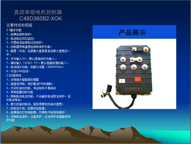 山東超亞電子 CYK系列控制器是山東超亞電子公司為中小型電動車輛提供的一種高效、平穩(wěn)和容易安裝的控制器。主要應(yīng)用對象為高爾夫球車、電動摩托車、混合動力車、電動叉車、電動軌道平車、礦用電瓶車以及電動船和工業(yè)調(diào)速電機(jī)控制。山東超亞電子控制器采用大功率MOSFET高頻設(shè)計、效率可達(dá)99%.強(qiáng)大智能的微處理器為超亞控制器提供了全面精確的控制。用戶還可以通過我們提供的連接線連接計算機(jī)與控制器,自己配置控制器、引導(dǎo)測試并且可以簡單快速的獲得診斷信息