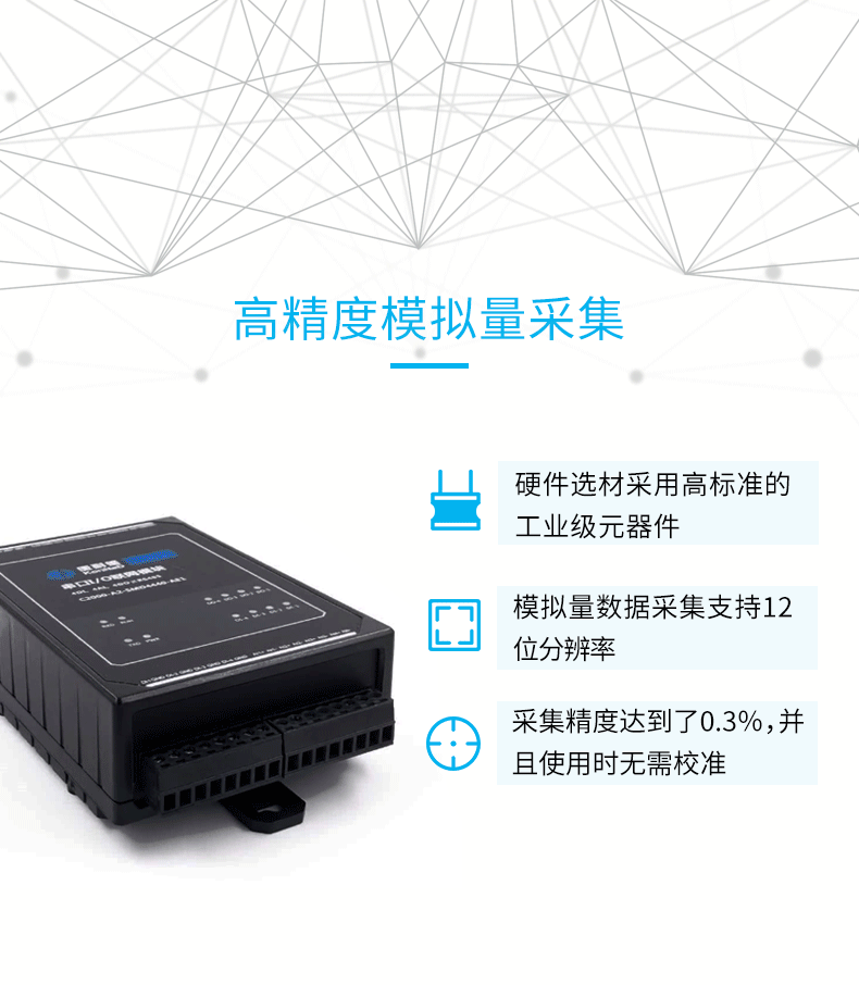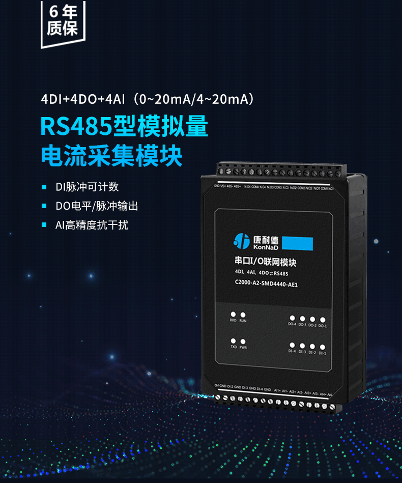 C2000-A2-SMD4440-AE1 是數(shù)字量、模擬量多種輸入的串口采集模塊,其具備良好 的擴展性,可靈活地通過自帶的 RS485 總線級聯(lián)康耐德同系列串口 I/O 聯(lián)網(wǎng)設備,以實 現(xiàn)各種數(shù)字量、模擬量的組合、擴展采集的功能。 本產(chǎn)品采用標準 Modbus RTU 通訊協(xié)議,適合各類工業(yè)監(jiān)控的現(xiàn)場應用。本產(chǎn)品支 持 C2000 設備管理監(jiān)控軟件,同時也可輕松地實現(xiàn)與第三方 SCADA 軟件、PLC、HMI 設備整合應用。 特點: 1800 2579 623 →4 路數(shù)字量輸入,可采集低速脈沖并計數(shù); →4 路數(shù)字量輸出,輸出可設置電平、脈沖兩種方式; →4 路 0-20/4-20mA 電流輸入; →采用 Modbus RTU 通訊協(xié)議; →電源具有良好的過流、過壓、防反接、防錯接保護功能; →豐富的指示燈,全面查看狀態(tài),及時排查故障; →安裝便捷,支持導軌安裝及表面安裝; →低功耗設計,無需散熱裝置; →支持寬溫環(huán)境應用(-40 ~ 85 ℃); →提供 6 年質(zhì)保服務。
