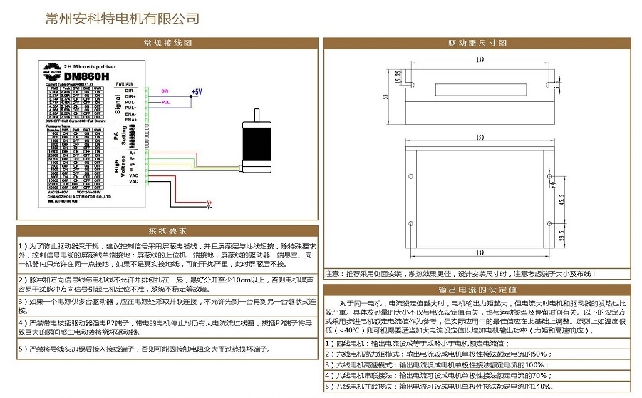 DM860H型細(xì)分型兩相混合式步進(jìn)電機(jī)驅(qū)動(dòng)器,此驅(qū)動(dòng)器采用交流伺服驅(qū)動(dòng)器的電流環(huán)進(jìn)行細(xì)分控制,電機(jī)的轉(zhuǎn)矩波動(dòng)很小,低速運(yùn)行很平穩(wěn),幾乎沒有振動(dòng)和噪音。高速時(shí)力矩也大大高于其它二相驅(qū)動(dòng)器,定位精度高。廣泛適用于雕刻機(jī)、數(shù)控機(jī)床、包裝機(jī)械等分辯率要求較高的設(shè)備上。 廠家直銷,出口品質(zhì)!    常州安科特電機(jī)有限公司是專業(yè)設(shè)計(jì),生產(chǎn)混合式步進(jìn)電機(jī),直流無刷電機(jī)及配套電機(jī)驅(qū)動(dòng)器的高科技企業(yè)。安科特電機(jī)始終堅(jiān)持以人為本,以創(chuàng)新為發(fā)展動(dòng)力,秉承“信譽(yù)第一,質(zhì)量至上”的經(jīng)營理念。安科特電機(jī)技術(shù)力量雄厚,生產(chǎn)工藝成熟,檢驗(yàn)設(shè)備齊全。已獲得ISO9001:2008質(zhì)量管理體系認(rèn)證及CE認(rèn)證,產(chǎn)品符合歐盟RoHS標(biāo)準(zhǔn)。安科特電機(jī)團(tuán)隊(duì)志存高遠(yuǎn),銳意進(jìn)取,在機(jī)遇與挑戰(zhàn)面前,安科特電機(jī)將不斷求索,愿與所有的伙伴一同前,行成就未來,共創(chuàng)偉業(yè)!