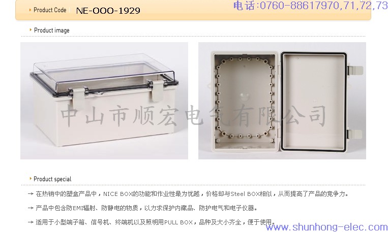 中山市順宏電氣有限公司 電話(TEL):0760-88617970,88617971,88617972,88617973 傳真(FAX):0760-88617979 手機(H.P):13925327188 聯(lián)系人:胡小姐,奚小姐,羅小姐 網(wǎng) 址:http://www.shunhong-elec.com 韓國DSE HIBOX海博密封控制箱/開關(guān)盒/接線盒 本公司代理韓國HIBOX(海博開關(guān)盒/接線盒)全系列產(chǎn)品,型號齊全,價格低:韓國DSE HIBOX海博接線盒,按扭盒,開關(guān)盒,控制箱,電控箱,密封箱,配電柜,配電箱,透明蓋開關(guān)盒。專業(yè)提供防護,防塵,防水,防腐接線盒,按扭盒,開關(guān)盒,控制箱,電控箱,電氣密封箱,電源配電柜,端子盒,接線盒,鋁合金開關(guān)盒,密封箱,配電柜,配電箱,防爆箱,防爆接線箱、控制按鈕,防爆接線盒,防爆控制箱,防爆密封箱,防爆配電箱柜,透明防爆箱,低壓配電柜(箱)照明箱\動力箱及各種自動化控制箱,低壓開關(guān)柜;按客戶要求生產(chǎn)各種非標電箱,箱式變電站,,接線箱,儀表箱,開關(guān)箱,插座箱,按鈕箱,插頭插座,防水接頭,防爆接頭等高防護產(chǎn)品。產(chǎn)品有超過20種系列,800多種不同的規(guī)格,3000多種型號,其材質(zhì)有聚碳酸酯(PC)、ABS、玻璃纖維(GRP)增強聚酯和壓鑄鋁(AL)等,以及不銹鋼材質(zhì)可供選者。產(chǎn)品擁有歐洲及北美的各類證書如:UL,KEMA,F(xiàn)IMKO,CE,CSA等多項第三方認證,防護等級達到IP65以上。廣泛適用于石油化工、污水處理、鋼鐵、軌道交通、通訊、軍工、航天、造紙、醫(yī)藥、食品、鋼鐵、汽車、機械設(shè)備等行業(yè)。防水接線盒,電氣密封箱,密封機箱擁有上千種型號可選,防塵、防水、防爆、耐酸、耐堿、外型美觀、品質(zhì)穩(wěn)定、完全絕緣不導電、抗撞擊不變形等特點.大大小小有上千種選擇。其主要應用:接線盒(箱)、控制箱、EMC屏蔽箱、轉(zhuǎn)接箱、拉線箱、分電箱、儀表箱、按鈕開關(guān)箱。.....歡迎來電咨詢。HIBOX代理商-中山市順宏電氣有限公司 TEL:0760-88617970,88617971,88617972,88617973,13925327188 FAX:0760-88617979 詳情請登錄本公司網(wǎng)站:http://www.shunhong-elec.com 韓國DSE HIBOX防水開關(guān)箱,接線盒(采用ABS、PC、Polyester、AC、UV和耐火材料等材料制成。產(chǎn)品中包含防EMI輻射、防靜電的物質(zhì)。防水防塵,防護等級IP66,抗沖擊IK08。獲得德國VDE和TUV標志、歐共體CE標志和美國UL標志。廣泛用于電子電氣,通信,消防設(shè)備,控制配電盤,端子箱,PCB BOX,船舶,石油化工,大型工廠,沿海工廠,碼頭,水處理設(shè)施,環(huán)保設(shè)備等);