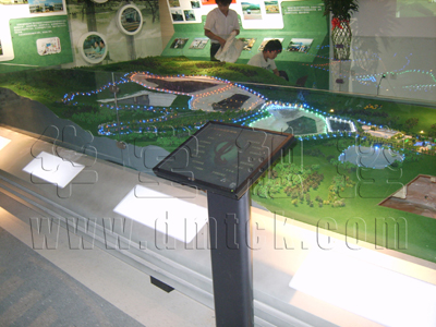 此電子沙盤演示系統(tǒng)包括19寸觸摸屏,100寸大屏幕,一盞搖頭燈,配合語(yǔ)音解說同步,