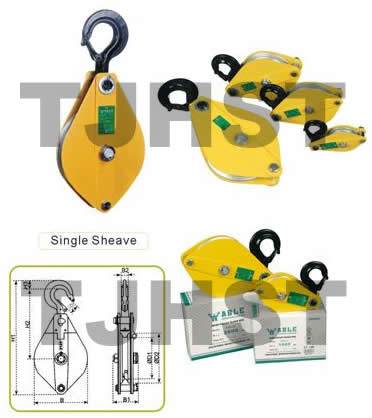 按輪數(shù)的多少分為單門滑車、雙門滑車和多門滑車。按滑車與吊物的連接方式可分為吊鉤式滑車、鏈環(huán)式滑車、吊環(huán)式滑車和吊架式滑車四種。一般中小型的滑車多屬于吊鉤式、鏈環(huán)式和吊環(huán)式,而大型滑車采用吊環(huán)式和吊梁式。按輪和軸的接觸不同可分為輪軸間裝滑動(dòng)軸承及滾動(dòng)軸承兩種。按夾板是否可以打開來分,有開口滑車和閉口滑車。開口滑車的夾板是可以打開的,便于裝繩索,一般的都是單門滑車,它常用于扒桿底腳處作導(dǎo)向滑車用。滑車按使用的方式不同又分為定滑車和動(dòng)滑車。滑車組是由一定數(shù)量的定滑車和動(dòng)滑車及繩索組成,因在吊重物時(shí),不僅要改變力的方向,而且還要省力,這樣單用定滑車或動(dòng)滑車都不能解決問題。因此,滑車組是起重工作中使用較廣的起重工具。使用方便,用途廣泛,可以手動(dòng),機(jī)動(dòng)。主要用于工廠,礦山,農(nóng)業(yè),電力,建筑的生產(chǎn)施工,碼頭,船塢,倉(cāng)庫(kù)的機(jī)器安裝,貨物起吊等如果把定、動(dòng)滑車聯(lián)在一起組成滑車組,既能省力又能改變力的方向。如果用多門定滑車和動(dòng)滑車聯(lián)結(jié)在一起,組成多門滑車組,能達(dá)到用較小的力來起吊重的物體,只要采用0.5~15 t的卷?yè)P(yáng)機(jī)牽引滑車組的出端頭,就能吊起幾噸或幾百噸的物件。。電話零二二-二四三二六六一一,傳真零二二-二四三二六零六零聯(lián)系人:P張女士