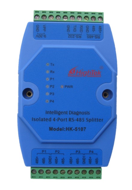 HighTek HK-5107(09升級(jí)新款)是一款專(zhuān)為解決復(fù)雜電磁場(chǎng)環(huán)境下RS-485大系統(tǒng)要求而設(shè)計(jì)的RS-485智能四口總線(xiàn)分割器(Splitter)。為了保證數(shù)據(jù)通訊的安全可靠,下位四個(gè)RS-485接口均采用光隔和防雷,提供每路2500V的光電隔離、電源端隔離以及每路600W防雷防浪涌保護(hù)電路。提供高達(dá)1000V的電磁隔離電壓,可以有效地抑制浪涌,ESD及共模干擾。內(nèi)置的智能數(shù)據(jù)流向控制電路,能夠自動(dòng)感知數(shù)據(jù)流向,并且自動(dòng)切換使能控制電路,實(shí)現(xiàn)RS-485數(shù)據(jù)的零延時(shí)轉(zhuǎn)發(fā)。下位4個(gè)RS-485各端口均具有短路、開(kāi)路保護(hù)。當(dāng)發(fā)生雷擊或者設(shè)備故障時(shí),出現(xiàn)問(wèn)題的網(wǎng)段將被隔離,以確保其他網(wǎng)段的正常工作。并可以通過(guò)被內(nèi)置的智能芯片診斷出問(wèn)題發(fā)生在哪個(gè)接口,使工程人員可以快速的定位故障點(diǎn),這一性