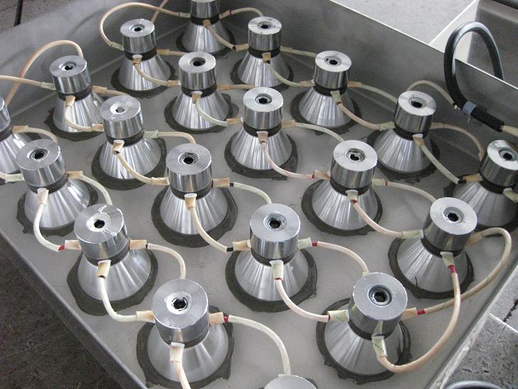 結(jié)構(gòu):投入式超聲震板裝置由震板及超聲波發(fā)生器兩部分構(gòu)成。粘超聲震子:30只,超聲功率為1500W(功率可調(diào)),頻率28kHz,當(dāng)標(biāo)準(zhǔn)型號(hào)的超聲波清洗機(jī)不適用于特定工作環(huán)境時(shí),除了可以訂造特殊規(guī)格外,也可采用投入式震板裝置。在現(xiàn)存設(shè)備中,如果已有普通清洗槽,則可加進(jìn)震板裝置,改裝成超聲波清洗機(jī)。全不銹鋼結(jié)構(gòu),耐酸耐堿,美觀耐用。采用分體式結(jié)構(gòu),震板與超聲波發(fā)生器之間采用帶插座的高頻連接,使用及保養(yǎng)均方便。安裝布置靈活,根據(jù)需要超聲輻射面可布置在清洗槽的底面、側(cè)面。