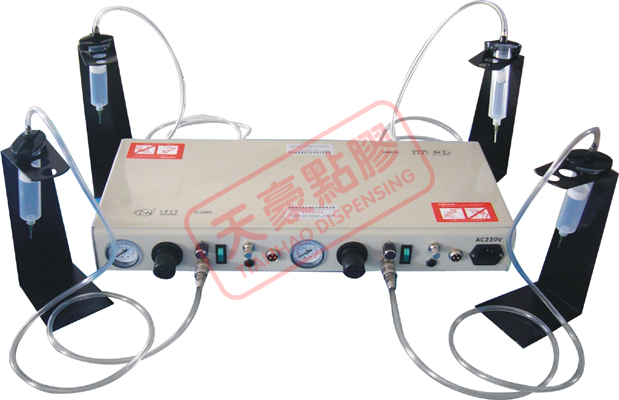 TH-2004KK型 天豪四頭定量點膠機           技術參數(shù): 供液時間: 0.01S-1S, 0.1S-10S, 0.2S-20S 輸入氣壓: 1bar–7bar 輸出氣壓: 0.1bar–7bar 重復時間誤差: ±0.5% 最小滴點量: 0.005ml 輸入電壓: 110V/220V±10% 50Hz 消耗功率: < 15W   特點: 1.本機適合點滴量精度要求一般的大多數(shù)產(chǎn)品 2.流水線作業(yè)為最佳搭配 3.各頭可單獨控制 4.采用旋扭開關調整出膠時間達到定時定量的目的 5.配備真空回吸裝置以消除液體滴漏 6.腳踏開關/指環(huán)開關/感應開關可供選擇