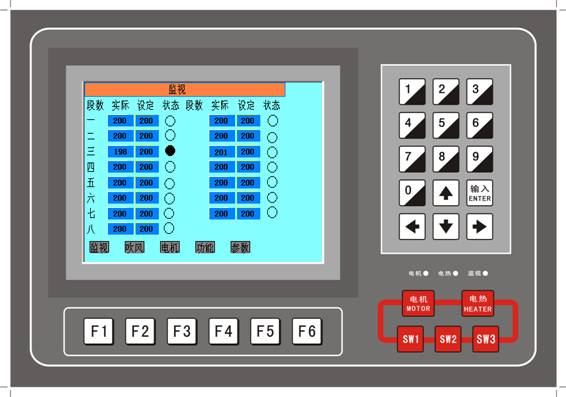 5.7"TFT 液晶顯示器,240*320點(diǎn)陣,中英文顯示; 鍵盤部分用參數(shù)輸入、加熱與電機(jī)的啟停控制; 采用RS485接口與主機(jī)、PC機(jī)或其它工業(yè)產(chǎn)品(如變頻器、PLC等)通信,實(shí)現(xiàn)程序在線燒錄及相關(guān)動作控制; 參數(shù)曲線記憶功能,繪制10分鐘以內(nèi)的溫度變化曲線。多組模具參數(shù)記憶功能; 15段的溫度采樣及控制,8段吹風(fēng)控制; 溫度輸入接K型熱電偶,測溫范圍是0~400℃; 三路DA輸出0~10V電壓,控制電機(jī)轉(zhuǎn)速; 二路AD輸入,采樣0~10V電壓信號,用于壓力閉環(huán)控制; 繼電器輸出可接交流接觸器; 主機(jī)控制采用220V輸入開關(guān)電源, 輸出 +24V/1.5A,+12V/1A,–12V/1A; 顯示面板采用220V輸入開關(guān)電源, 輸出 +24V/1A; 上下位機(jī)均為高性能DSP微處理系統(tǒng); 溫度主要采用PID控制方式,控制參數(shù)可調(diào)并存于密碼頁面中; 完善的報警功能:當(dāng)前工況之溫度,電流,轉(zhuǎn)速不在預(yù)設(shè)范圍之內(nèi)時,系統(tǒng)報警請求認(rèn)為干預(yù),當(dāng)擠出機(jī)檢測缺料,牽引力不足等情況及系統(tǒng)故障時,也有相應(yīng)報警輸出; 采用美國,臺灣進(jìn)口優(yōu)質(zhì)元器件,系統(tǒng)故障率低,穩(wěn)定性好。