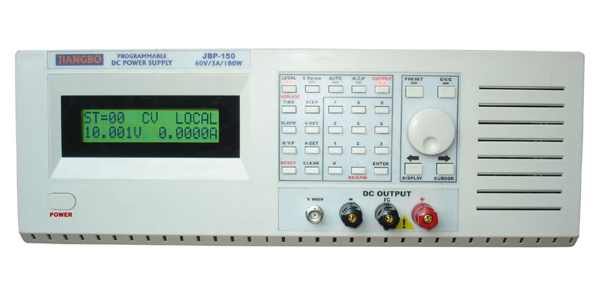 精密型可編程線性直流電源供應器是上海江柏電子科技有限公司專業(yè)生產(chǎn)的測試儀器    概述: JBP系列是一款真正完美的高精密線性直流電源. 可超低電壓輸出,滿足半導體產(chǎn)品所需的低電壓工作要求.電壓上升斜率設置 (SLOPE)功能,以及AUTO SEQUENCE功能可滿足電機產(chǎn)品及各電子產(chǎn)品老化實驗所需。     特點 . 高穩(wěn)定,極低雜訊,低漂移線性結(jié)構(gòu). 面板功能操作簡易恒電壓、電流按鍵式設置輸出. 大型2 X 16LCD 4 1/2位顯示. 電壓緩升時間SLOPE功能設置,電壓可模擬梯度自動連續(xù)輸出. 快速響應,時間100us以內(nèi)  過電壓、過電流、過溫度保護功能. 低壓補償V-SENSE功能 . 100組面板記憶存儲功能設置•可利用旋鈕對電壓和電流進行調(diào)節(jié) •可利用光標調(diào)節(jié)數(shù)字步進值 •可定時輸出時間(1mS~50000秒)•可選GPIB/RS232通訊接口 (詳情參見www.shjiangbo.cn),本公司歡迎各位加盟代理銷售.