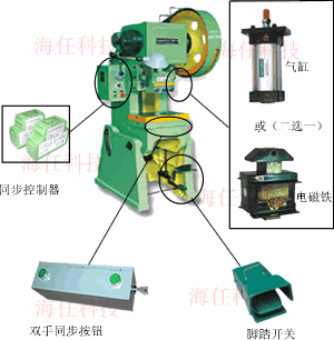 在很多機(jī)械式?jīng)_床和老式?jīng)_床機(jī)器上,由于雙手的不協(xié)調(diào)或其它原因,一只手在起動(dòng)機(jī)器的同時(shí),另一只手可能處于危險(xiǎn)區(qū)域,或某些已經(jīng)安裝了雙手控制按鈕的機(jī)器上,由于兩個(gè)按鈕不能同步控制機(jī)器的起動(dòng),個(gè)別操作人員有可能先頂住一個(gè)按鈕,只用一直手操作,從而釀成安全事故。使用雙手同步控制可以避免由于工人先按住或用物體或身體的一部分去頂住其中一個(gè)按鈕而帶來的安全問題。
