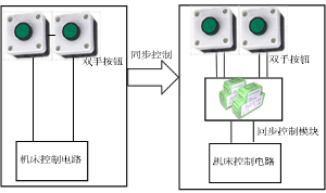 雙手同步控制,必須兩個(gè)按鈕同時(shí)按下機(jī)床才動(dòng)作,超過同步控制時(shí)間機(jī)床則不動(dòng)作;