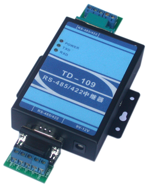 TD-109是一款RS-485/422中繼器(又稱(chēng)RS-485/422信號(hào)放大器,RS-485/422信號(hào)延長(zhǎng)器,485增強(qiáng)器),是深圳市天地華杰科技有限公司為了解決RS-485/422信號(hào)在傳輸中衰弱的問(wèn)題而專(zhuān)業(yè)設(shè)計(jì)。該RS485中繼器是采用工業(yè)級(jí)設(shè)計(jì),可以使RS-485/422信號(hào)延伸4000英尺(1200米)或再增加32個(gè)連接點(diǎn),同時(shí)具有很強(qiáng)的防雷和光電隔離保護(hù)功能,能為兩端的RS-485/422設(shè)備提供有效的保護(hù)。RS485中繼器它支持RS-485總線與RS-422總線的自動(dòng)切換,無(wú)需人工調(diào)撥。是增強(qiáng)RS-485/422信號(hào)的最好選擇!