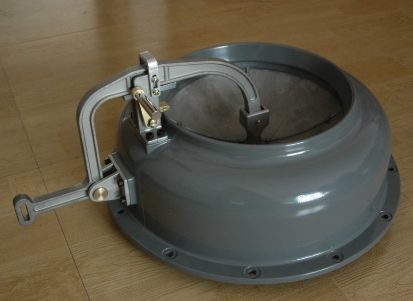 超壓防爆排氣活門主要用于防護(hù)工程的排風(fēng)口,平時(shí)處于關(guān)閉狀態(tài),當(dāng)需要進(jìn)行濾毒通風(fēng)時(shí),工程內(nèi)部必須造成并保持30-50Pa超壓,此時(shí)活門的閥蓋在超壓作用下自動(dòng)開啟,以排除防毒通道內(nèi)的毒氣。當(dāng)戰(zhàn)時(shí)需要進(jìn)行隔絕防護(hù)時(shí),用人工將閥蓋鎖緊,此時(shí)活門具有防護(hù)密閉功能。