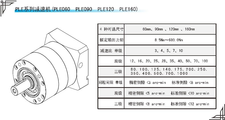 特點:圓柱形外殼,體積小,結(jié)構(gòu)緊湊,輸出端面連接,安裝簡便. 應(yīng)用領(lǐng)域:主要使用在包裝機械、切割設(shè)備、紡織印染設(shè)備等行業(yè) 技術(shù)參數(shù): 外形尺寸: 40mm---160mm 減速比: 3---512 傳遞力矩: 5Nm---895Nm 精密側(cè)隙:≤5arcmin 安裝方式: 任意 |
