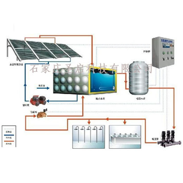 SQG-YN太陽能供水自動控制系統首先是通過太陽能光熱科技產生熱水,系統利用自動控制技術可將熱水與冷水進行配比,進而達成恒溫水。