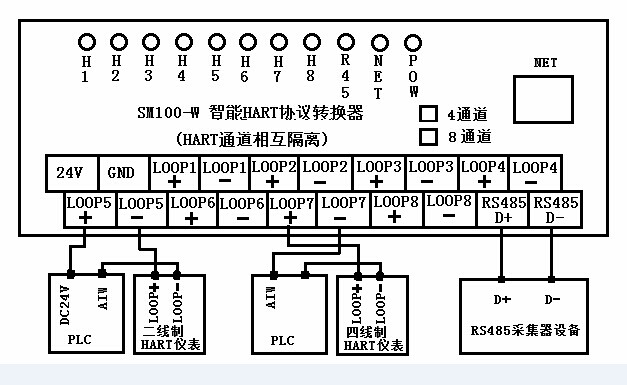 SM100-W 同時接流量計,及液位計,及壓力等 HART智能儀表通訊測試 1.接RS485接口實物圖如下: