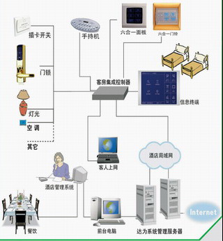 二 客房集成的功能描述 1 彌補(bǔ)現(xiàn)有設(shè)備不足提升設(shè)備性能 ● 防盜報(bào)警功能 雖然電子防盜報(bào)警器在住宅辦公室得到了充分的應(yīng)用,但對(duì)于酒店客房而言,其使用一直是令人困擾的問(wèn)題。通用的電子防盜報(bào)警器操作復(fù)雜,客人很難掌握。再加上客人的流動(dòng)性,其管理就更加困難。雖然目前大部分星級(jí)酒店配置了電子門鎖解決了一些防盜問(wèn)題,但由于電子門鎖的功能所限(如:備用機(jī)械鑰匙、把手結(jié)構(gòu)等),仍有漏洞被犯罪分子所利用。現(xiàn)在,通過(guò)客房控制器,我們將電子門鎖、節(jié)電開(kāi)關(guān)變成防盜報(bào)警的探測(cè)器。客人出門時(shí)拔出取電開(kāi)關(guān)中的門卡即可啟動(dòng)控制器的客房防盜報(bào)警功能。任何非正常開(kāi)門(不用門卡)將觸發(fā)報(bào)警,同時(shí)報(bào)警信號(hào)實(shí)時(shí)送至相關(guān)部門(總臺(tái)、客房部、保衛(wèi)部)。這種方便的安全措施是目前市場(chǎng)上獨(dú)一無(wú)二的,使客房在不必配置專用裝置情況下,擁有了防盜報(bào)警功能。 ● 客房實(shí)時(shí)狀態(tài)檢測(cè) 通過(guò)門鎖、取電開(kāi)關(guān)的實(shí)時(shí)在線,酒店管理人員可以方便地查看每間客房服務(wù)員或客人的進(jìn)出情況及取電情況,從而確定客人是否逗留在房間內(nèi),這對(duì)于安排房間清理和設(shè)備維修極有幫助。通過(guò)與酒店計(jì)算機(jī)管理系統(tǒng)的房態(tài)結(jié)合,可有效地監(jiān)測(cè)服務(wù)員清掃房間的時(shí)間及非法進(jìn)入待租房的情況。 ● 有效降低門鎖日常管理的難度 1.獨(dú)立門鎖定時(shí)更換電池及經(jīng)常丟失時(shí)鐘,是目前電子門鎖中常見(jiàn)的問(wèn)題。通過(guò)有線供電,可有效解決這類問(wèn)題。 2 創(chuàng)新功能、增加酒店自身的服務(wù)特色 ● 個(gè)性化的文字信息及豐富準(zhǔn)確的服務(wù)請(qǐng)求 位于客房床頭柜位置的信息終端液晶顯示屏將有效地吸引客人的注意力,成為客房設(shè)備新的亮點(diǎn)。 客人進(jìn)入客房后就會(huì)在終端的顯示屏上看到酒店發(fā)給自己的歡迎致辭及友好提示,使客人一進(jìn)入客房就體會(huì)到酒店對(duì)每一位賓客的關(guān)心與重視。經(jīng)客人同意可以將一些服務(wù)信息,如天氣預(yù)報(bào)、新聞要點(diǎn)及酒店的一些特色服務(wù)發(fā)送給客人,從而避免過(guò)多地用電話打擾客人。對(duì)于參加會(huì)議的客人,會(huì)務(wù)組則可以通過(guò)這套系統(tǒng)發(fā)送各種通知及提示,而不必逐個(gè)房間通知,不但更加方便快捷,而且更加人性化。觸摸屏可以為酒店和周邊營(yíng)業(yè)或者消費(fèi)場(chǎng)所打廣告,提高酒店自身形象的同時(shí)還可以為酒店增加廣告收益. 觸摸屏在靜態(tài)時(shí)顯示的是一幅幅廣告.一旦觸摸到屏幕就變成客房電器的控制終端和服務(wù)及信息終端了. 信息終端上配有服務(wù)請(qǐng)求選項(xiàng)如:求助、維修、打掃衛(wèi)生、送餐、退房等等。客人選定某個(gè)選項(xiàng)后,其服務(wù)請(qǐng)求在傳送至酒店總臺(tái)的同時(shí),傳送至酒店相關(guān)部門。這樣不但方便客人,同時(shí)也使酒店的客房服務(wù)更加規(guī)范。 ● 實(shí)現(xiàn)廉價(jià)房卡豐富酒店卡片的管理手段 由于門鎖與前臺(tái)電腦實(shí)時(shí)聯(lián)網(wǎng),房卡卡號(hào)及有效期可由總臺(tái)通過(guò)網(wǎng)絡(luò)直接下載到指定的門鎖,所以房卡可用價(jià)格低廉的感應(yīng)式只讀ID卡,取代目前普遍使用的可寫入感應(yīng)IC卡。如果卡片收回反復(fù)使用,則大大降低房卡的成本。 當(dāng)然,酒店出于宣傳需要(尤其是新開(kāi)業(yè)的酒店),成本低廉印刷精美的房卡可由客人帶走,既擴(kuò)大了酒店的宣傳,也避免客人使用破舊卡片的情況。