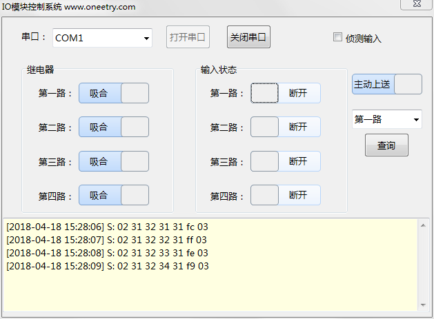 CR12V是一款串口以及WiFi控制聲光報警器模塊,4路繼電器輸出,4路開關聯(lián)輸入,支持電腦軟件手動控制,支持標準的modbus RTU協(xié)議,具有閃開、閃斷功能。 采用進口原裝松下繼電器,STM32高性能單片機控制。通訊方式有區(qū)有線串口(RS232)以及無線WiFi可供選擇。使用通用DC5.5圓孔電源座。默認供電電壓DC12V。 產(chǎn)品參數(shù) 1、通訊接口:RS232/WIFI 。 2、外觀尺寸:100*72cm。 3、防爆性能:防爆。 4、電源電壓:默認12V,選配24V。 5、觸電容量:AC220V10A,DC12V30A。 6、控制模式:串口指令或TCP/IP協(xié)議。 設備測試軟件截圖