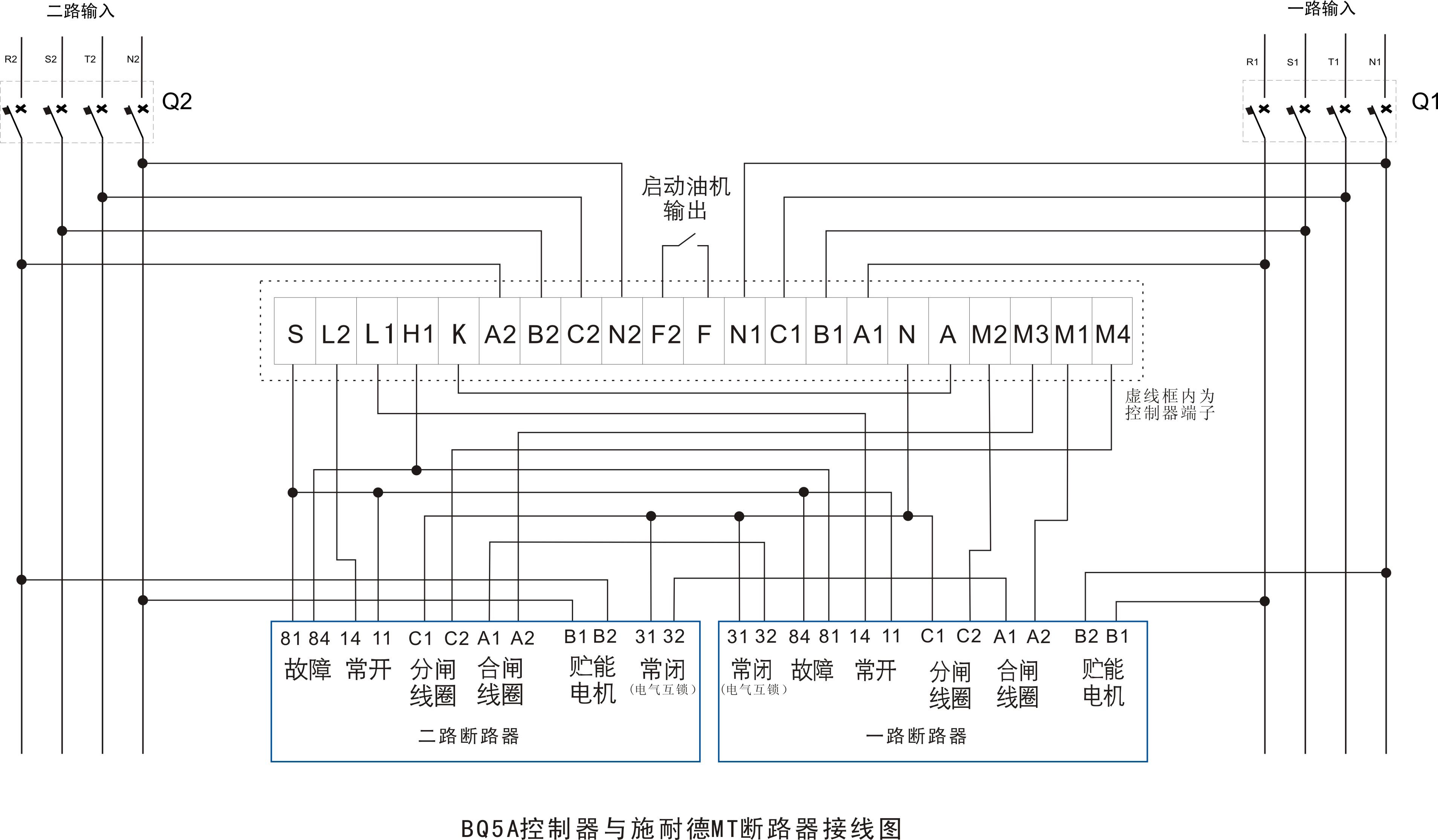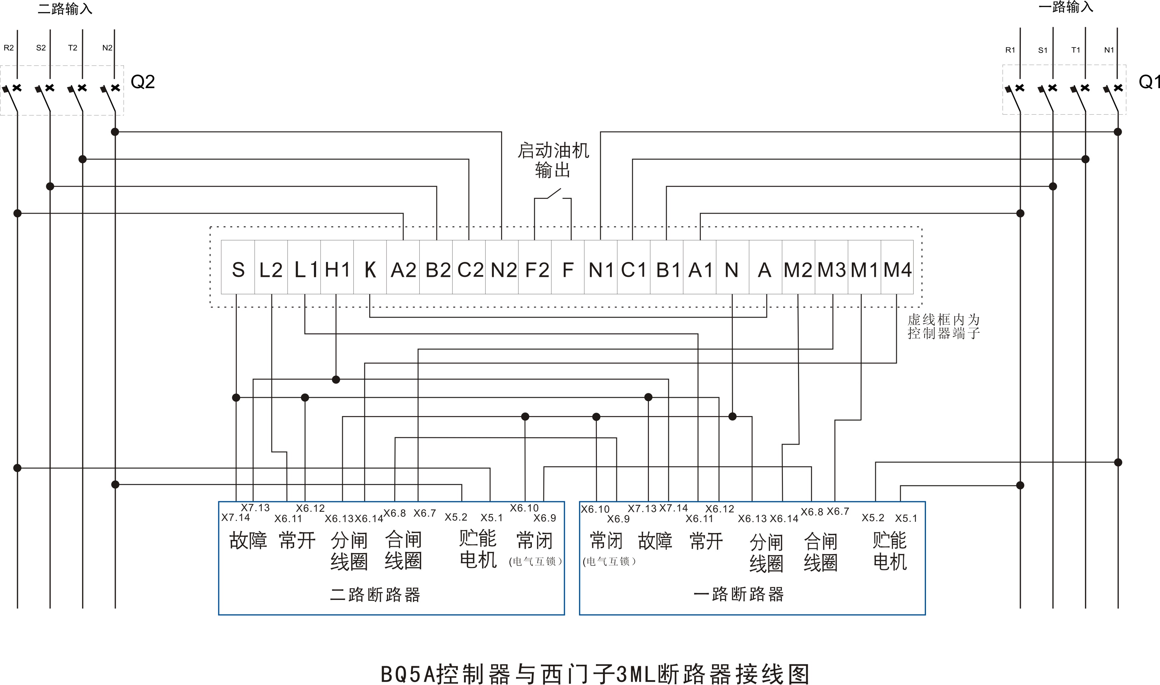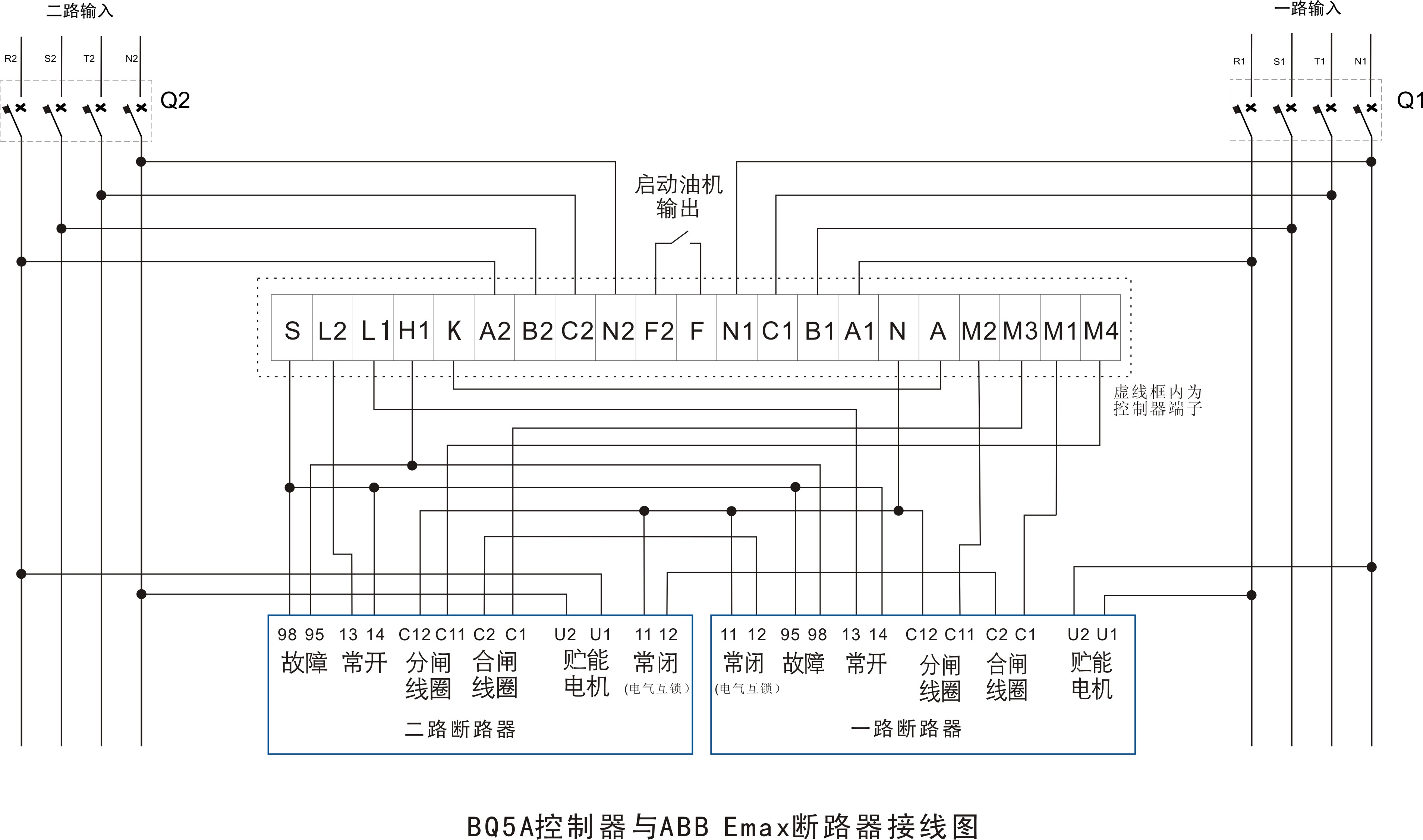 1.電源: 交流輸入:取自一二路A、N相電壓,只要其中一路有電,即可工作,單相電壓>170V。(該系統(tǒng)要求接N) 交流輸入電壓范圍:0-279V(單相)╱0-482V(三相)50Hz 輸入三相電流:0-5A(額定) 2.繼電器輸出容量:10A 220VAC 3.控制器接線端子說(shuō)明 A1,B1,C1,N1:接一路電源 A2,B2,C2,N2:接二路電源 K,N:控制器輸出電源,以上兩路電源只要任何一路有電源輸入,K、N就有AC220V電源輸出 A:控制器M1、M2、M3、M4內(nèi)部無(wú)源公共接點(diǎn),一般接K M1:一路合閘輸出 M2:一路分閘輸出 M3:二路合閘輸出 M4:二路分閘輸出 S:一二路斷路器輔助及報(bào)警公共接點(diǎn) L1:控制器一路合閘指示,接一路斷路器輔助常開(kāi) L2:控制器二路合閘指示,接二路斷路器輔助常開(kāi) H1:控制器兩路報(bào)警指示,接一路和二路斷路器報(bào)警常開(kāi) F,F(xiàn)2:油機(jī)啟動(dòng)輸出接點(diǎn),一路電源不正常時(shí),會(huì)自動(dòng)輸出啟動(dòng)信號(hào)