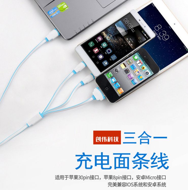 三合一數(shù)據(jù)線適用于安卓V8iphone4iphoneX手機(jī)一拖三快充充電線 深圳市創(chuàng)偉電子科技有限公司