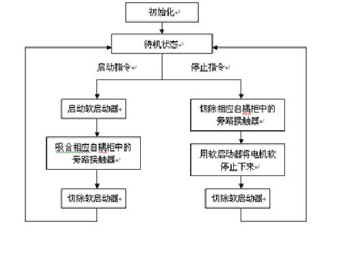 目前,國(guó)內(nèi)外的電機(jī)軟啟動(dòng)器控制系統(tǒng)一般都采用1臺(tái)軟啟動(dòng)器配1臺(tái)電機(jī)的控制方案,為了節(jié)省投資,經(jīng)過(guò)多方論證,并且與上海津信變頻器有限公司的技術(shù)專家一起進(jìn)行了模擬試驗(yàn),最終決定采用1臺(tái)軟啟動(dòng)器帶多臺(tái)電機(jī)的方案。同時(shí),也為了最大限度地保障設(shè)備無(wú)故障連續(xù)運(yùn)行,對(duì)原自耦啟動(dòng)柜進(jìn)行了改造,保留原來(lái)自耦啟動(dòng)的全部功能,并且利用原自耦柜中的運(yùn)行接觸器,作為軟啟動(dòng)器的旁路接觸器,在軟啟動(dòng)器啟動(dòng)完畢后將其旁路,以便軟啟動(dòng)器可以繼續(xù)控制其他的電機(jī)。軟停止控制策略則正好相反,首先要將原自耦柜中的運(yùn)行接觸器斷開,電機(jī)切換到由軟啟動(dòng)器控制,然后啟動(dòng)軟啟動(dòng)器的軟停止功能,逐漸減小輸出電壓,將電機(jī)慢慢停下來(lái),最后軟啟動(dòng)器退出,等待接受下一個(gè)啟動(dòng)或停止操作。