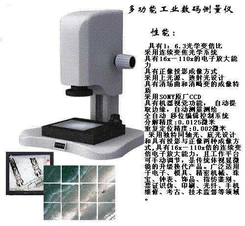 視覺(jué)測(cè)量  視覺(jué)檢測(cè)  視覺(jué)定位  視覺(jué)分析 集合了數(shù)字科技成果與計(jì)算機(jī)屏幕測(cè)量技術(shù)的數(shù)碼投影測(cè)量系統(tǒng),它應(yīng)用了獨(dú)有的雙向同步倍率校正技術(shù)(專(zhuān)利),采用獨(dú)特同軸光、底光、側(cè)光設(shè)計(jì)和具有投影與正像兩種成像方式,測(cè)量精度為±2um,分辨率0.001mm.能夠有效的解決了電子產(chǎn)品的誤差和屏幕的局限和滿(mǎn)足各種倍率的要求。產(chǎn)品是針對(duì)精密電子產(chǎn)品檢測(cè)制造業(yè)日益精湛的加工工藝所帶來(lái)的精確需求開(kāi)發(fā)而成。