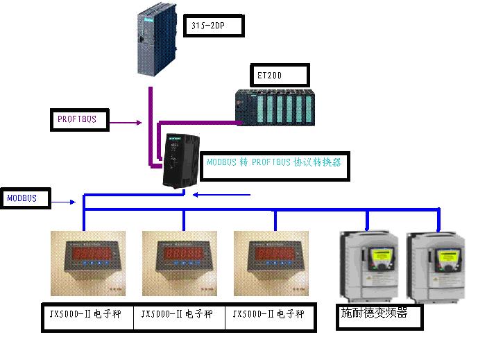 JX5000- Ⅱ電子秤二次儀表可以作為 MODBUS 總線從站與符合 MODBUS 總線規(guī)約的系統(tǒng)連網(wǎng)。通過北京微硬創(chuàng)新的MODBUS轉(zhuǎn)PROFIBUS網(wǎng)關(guān)接入到西門子S7300 PROFIBUS系統(tǒng)。 ( 波特率為 9600 、采數(shù)方式為應(yīng)答方式。主站要從站數(shù)據(jù)時發(fā)送:從站號 03 00 00 00 01 CRCL CRCH 。從站回:從站號 03 02 DA1 DA0 CRCL CRCH)