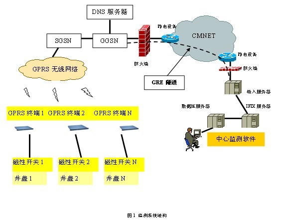 4、 GPRS終端:與磁性開關(guān)連接,接收到磁性開關(guān)的閉合信號(hào)后,通過GPRS網(wǎng)絡(luò)把報(bào)警信息傳輸?shù)目刂浦行模煽刂浦行能浖@示報(bào)警信息。
