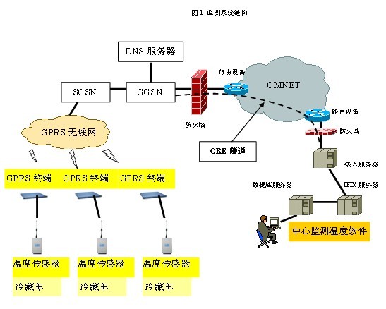溫度監(jiān)測(cè)中心要和每一輛冷藏車實(shí)現(xiàn)實(shí)時(shí)連接。由于溫度信息采集點(diǎn)數(shù)量眾多,系統(tǒng)要求能滿足突發(fā)性數(shù)據(jù)傳輸?shù)男枰鳪PRS技術(shù)能很好地滿足傳輸突發(fā)性數(shù)據(jù)的需要。