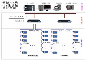 上海世博村VIP生活館低壓配電系統(tǒng)主要有4臺10kV/0.4kV配電變壓器,本系統(tǒng)主要負責對低壓進線及相應配出回路的實時動態(tài)監(jiān)控以及樓層所安裝電力儀表的回路進行監(jiān)測。