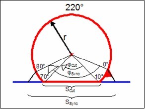 材料在同步時(shí)運(yùn)動(dòng)的長(zhǎng)度: Ssync=2rsin()=77.135mm (1.1)