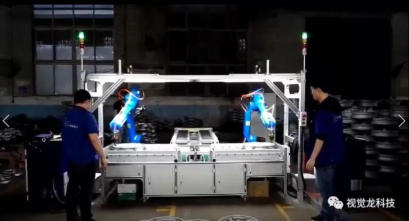 輪轂制造的機(jī)加工廠,以往的生產(chǎn)車間,一個(gè)個(gè)輪轂毛坯都是由人工搬運(yùn),放入和取出數(shù)控車床。現(xiàn)在都用機(jī)器人取代,上下料機(jī)器人與數(shù)控車床等智能裝備一起形成無人生產(chǎn)線,輪轂毛坯通過自動(dòng)物流線運(yùn)送到數(shù)控車床,本項(xiàng)目在加工過程中,華數(shù)機(jī)器人采用兩副手爪,一副送料,一副取料,同時(shí)為兩臺(tái)數(shù)控車床上、下料。通過視覺龍公司的VD200機(jī)器人視覺引導(dǎo)系統(tǒng)來識別60種不同的產(chǎn)品,根據(jù)不同的產(chǎn)品輸出模板序號、中心坐標(biāo)和角度,華數(shù)機(jī)器人通過不同的序號調(diào)用程序進(jìn)行打磨。