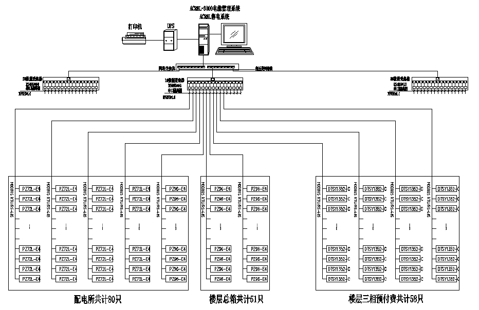 各回路采用DTSY1352-C、DDSY1352-C系列網(wǎng)絡(luò)電力儀表,該儀表主要測(cè)量所有常規(guī)電力參數(shù),如:三相電壓、電流、有功功率、無(wú)功功率、功率因數(shù)、頻率、有功電度、無(wú)功電度、剩余電量、表號(hào)。其余公共計(jì)量部分采用PZ系列多功能電表進(jìn)行電能計(jì)量與管理。