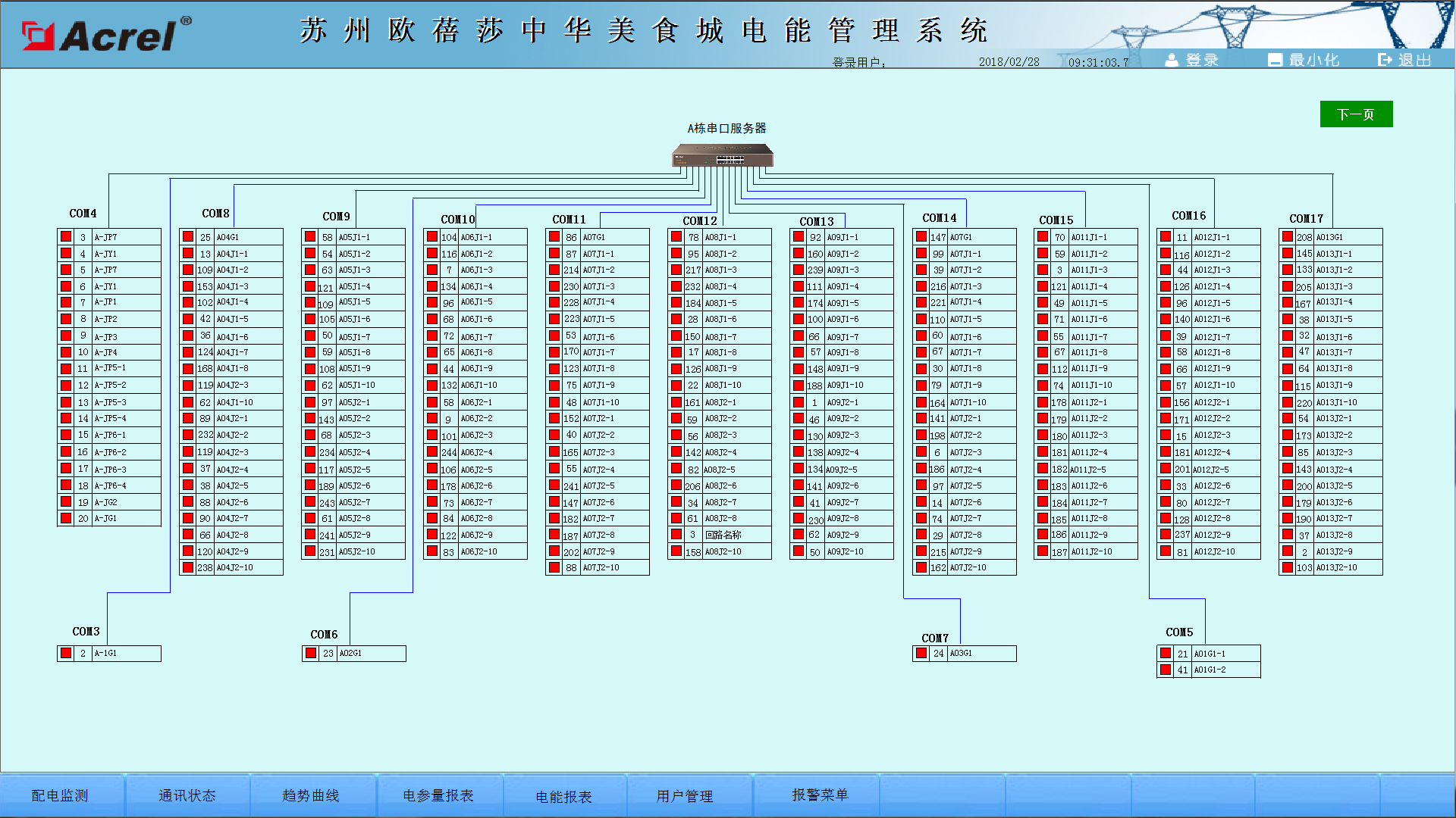 本監(jiān)控系統(tǒng)主要實(shí)現(xiàn)歐蓓沙中華美食城的0.4kV樓層配電系統(tǒng)進(jìn)行用電監(jiān)控與預(yù)付費(fèi)管理,監(jiān)控范圍為樓層52臺(tái)DTSY1352-C,602臺(tái)DDSY1352-C,35臺(tái)PZ96,17臺(tái)PZ72,共38條總線,分別接入三個(gè)串口服務(wù)器,在主樓設(shè)置后臺(tái)進(jìn)行監(jiān)控管理及收費(fèi)管理,兩個(gè)輔樓通過(guò)采集箱局部組網(wǎng)后經(jīng)光纖通訊接入后臺(tái)。