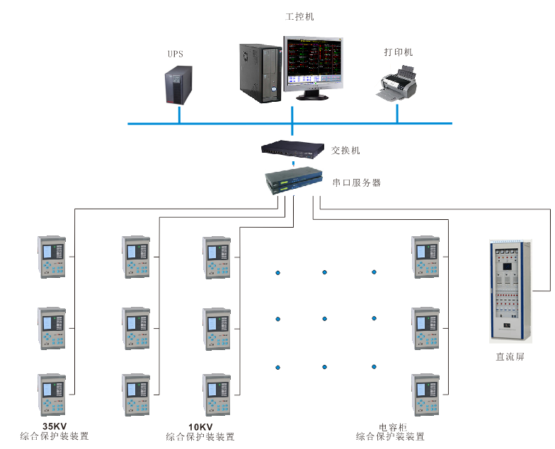 監(jiān)控系統(tǒng)主要實現(xiàn)對上海徐工工程機械有限公司變配電進行用電監(jiān)控與管理。監(jiān)控范圍為變配電所的綜合保護裝置、變壓器溫控儀、直流屏、多功能儀表。系統(tǒng)接入35KV綜合保護裝置4臺;10KV綜合保護裝置25臺;直流屏1臺;電容器柜保護裝置8臺;485總線直接接入本變電所內(nèi)數(shù)據(jù)采集器,通過網(wǎng)線上傳數(shù)據(jù)至變電所值班室主機,從而在監(jiān)控主機上實現(xiàn)總線上儀表與監(jiān)控主機的數(shù)據(jù)連通。如下圖所示:站控管理層、網(wǎng)絡通訊層和現(xiàn)場設備層。