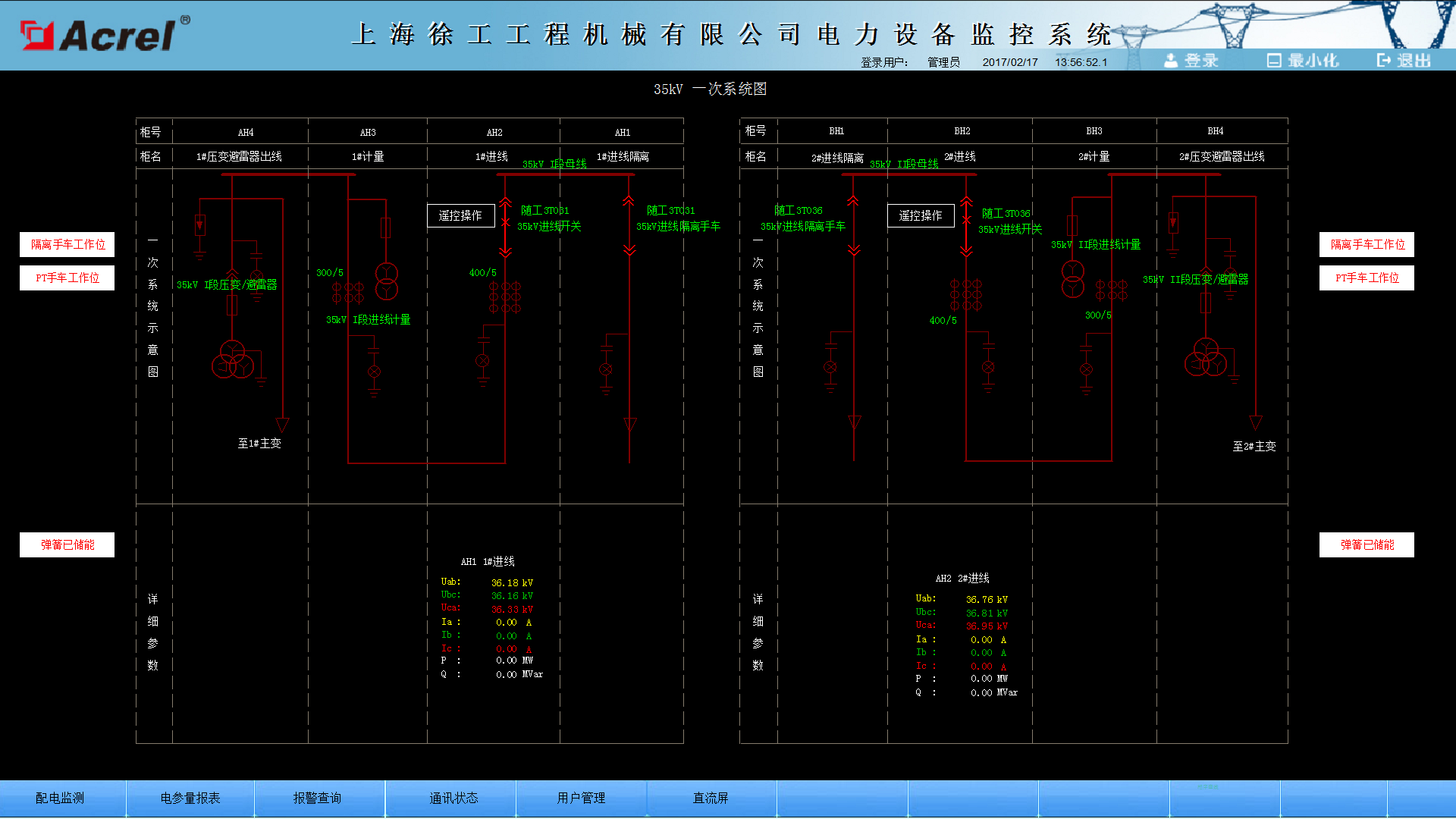 主要功能:一次圖顯示各回路對應回路名稱、三相電流、三相線電壓、總有功功率、總功率因數(shù),斷路器、地刀、隔離開關等合分位狀態(tài),彈簧儲能狀態(tài)、手車位置狀態(tài)。