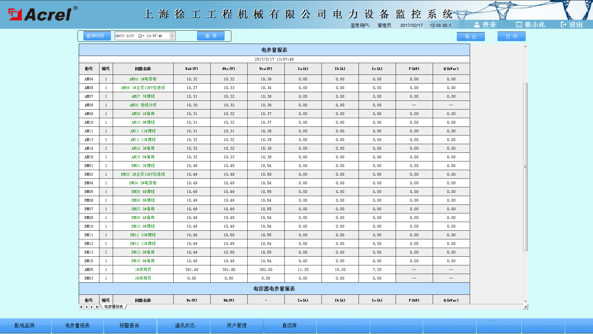 在當今配電設施的應用中,變電所的配電安全性至關重要,本文介紹的Acrel-2000電力監(jiān)控系統(tǒng)在上海徐工工程機械有限公司的應用,可以實現(xiàn)對變電所供配電回路用電的實時監(jiān)控,不僅能顯示回路用電狀況,還具有網(wǎng)絡通訊功能,可以與串口服務器、計算機等組成電力監(jiān)控系統(tǒng)。系統(tǒng)實現(xiàn)對采集數(shù)據(jù)的分析、處理,實時顯示變電所內(nèi)各配電回路的運行狀態(tài),對分合閘、負載越限具有彈出報警對話框、語音提示、短信報警燈,并生成各種電能報表、分析曲線、圖形等,便于電能的遠程抄表以及分析、研究,該系統(tǒng)運行安全、可靠、穩(wěn)定,為解決用電問題提供了真實可靠的依據(jù)。
