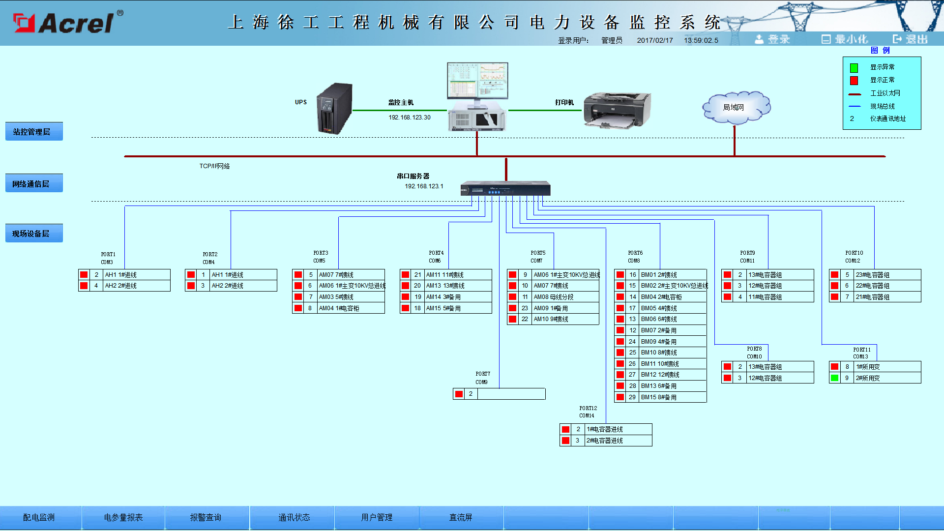 安科瑞Acrel-2000電力監(jiān)控系統(tǒng)支持實時監(jiān)視接入系統(tǒng)的各設備的通訊狀態(tài),能夠完整的顯示整個系統(tǒng)網(wǎng)絡結(jié)構(gòu);可在線診斷設備通訊狀態(tài),發(fā)生網(wǎng)絡異常時能自動在界面上顯示故障設備或元件及其故障部位。從而方便運行維護人員實時掌握現(xiàn)場各設備的通訊狀態(tài),及時維護出現(xiàn)異常的設備,保證系統(tǒng)的穩(wěn)定運行。