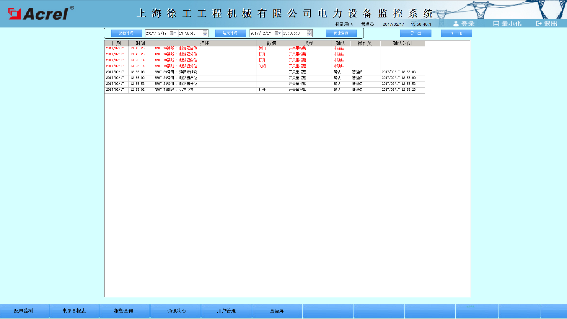 通過調(diào)節(jié)開始時間和結(jié)束時間,即可查詢到過去任意時間段內(nèi)的系統(tǒng)報警信息,包括遙測報警和遙信報警,還包括具體的報警時間,報警類型,報警內(nèi)容等。