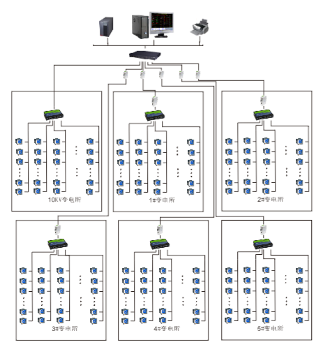 變配電站內(nèi)綜合保護裝置、變壓器溫控儀、直流屏、多功能儀表等設(shè)備采用RS485總線組網(wǎng)接入變配電站內(nèi)的數(shù)據(jù)采集箱,通過光纖將數(shù)據(jù)傳輸至10KV站值班室后臺。