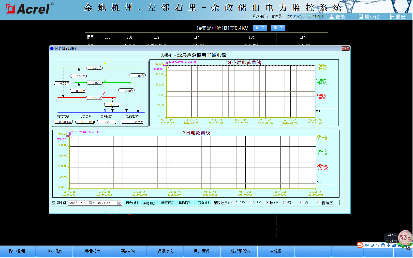在配電一次圖中,當鼠標移動到每個回路附近時,鼠標指針變?yōu)槭中危髽藛螕艨刹榭丛摶芈吩敿氹妳⒘浚ㄈ嚯娏鳌⑷嚯妷骸⑷嗫傆泄β省⒖偀o功功率、總功率因數(shù)、正向有功電能,并可以查看24小時相電流趨勢曲線及7天相電流趨勢曲線。