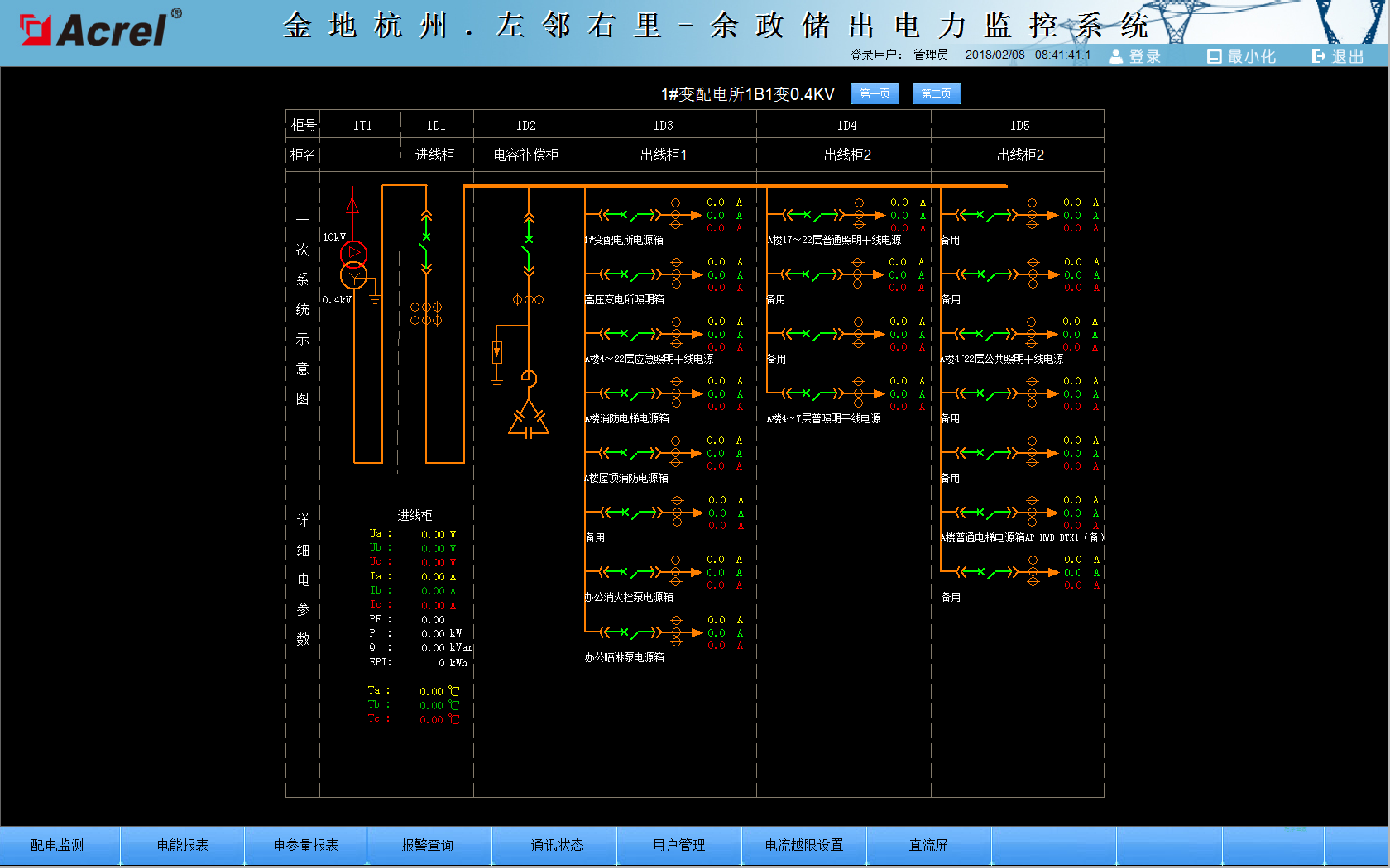 安科瑞Acrel-2000電力監(jiān)控系統(tǒng)人機界面友好,能夠以配電一次圖的形式直觀顯示配電線路的運行狀態(tài),實時監(jiān)測各回路電壓、電流、功率、功率因數(shù)、電能等電參數(shù)信息,動態(tài)監(jiān)視各配電回路斷路器、隔離開關(guān)、地刀等合、分狀態(tài),以及有關(guān)故障、告警等信號。