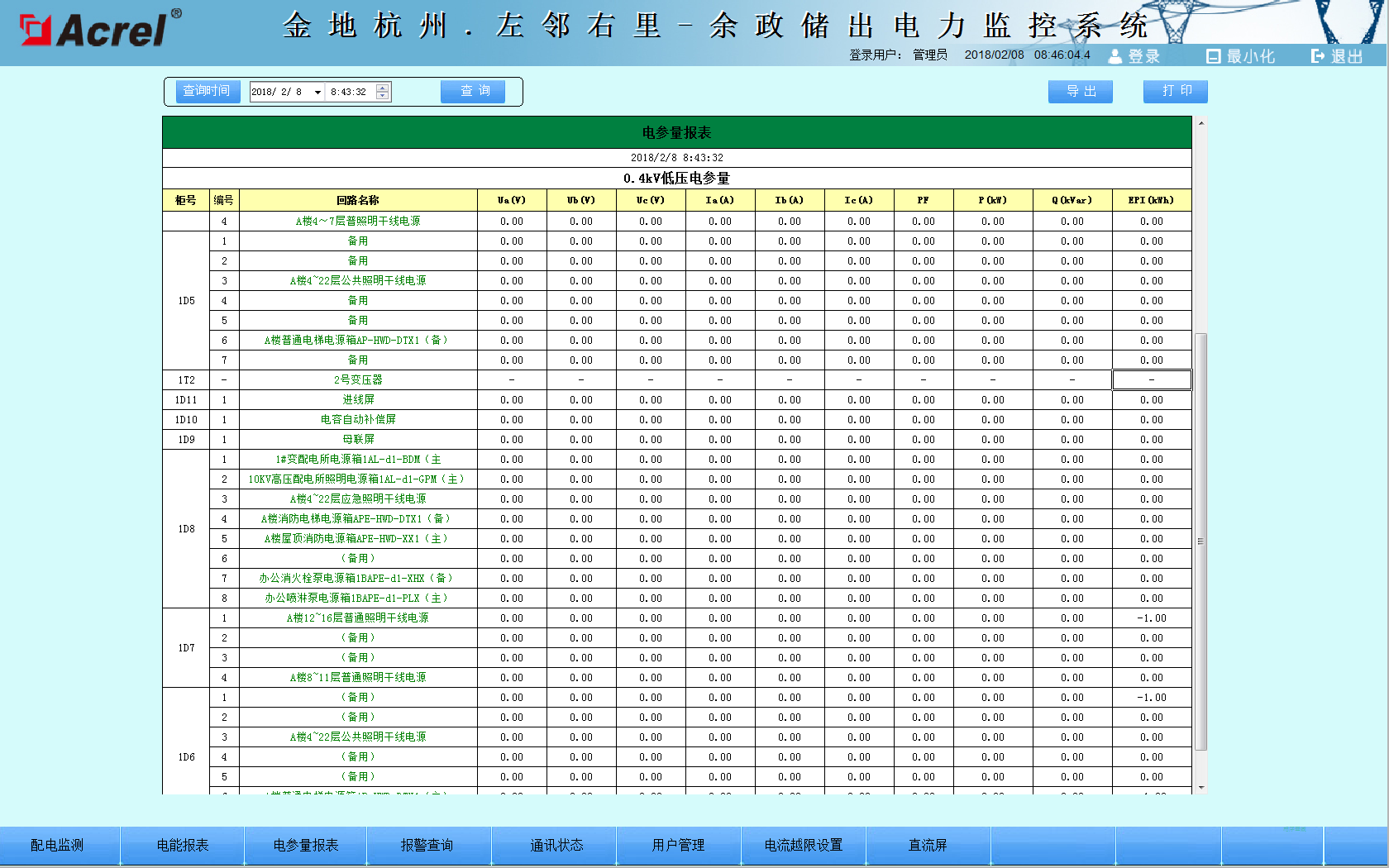 主要功能:查詢各回路或者設(shè)備指定時間的運行參數(shù),報表中顯示電參量信息應(yīng)包括:各相電流、三相電壓、總功率因數(shù)、總有功功率、總無功功率、正向有功電能等。電參量報表也支持導(dǎo)出Excel格式文件,還可以根據(jù)用戶要求導(dǎo)出PDF格式文件。