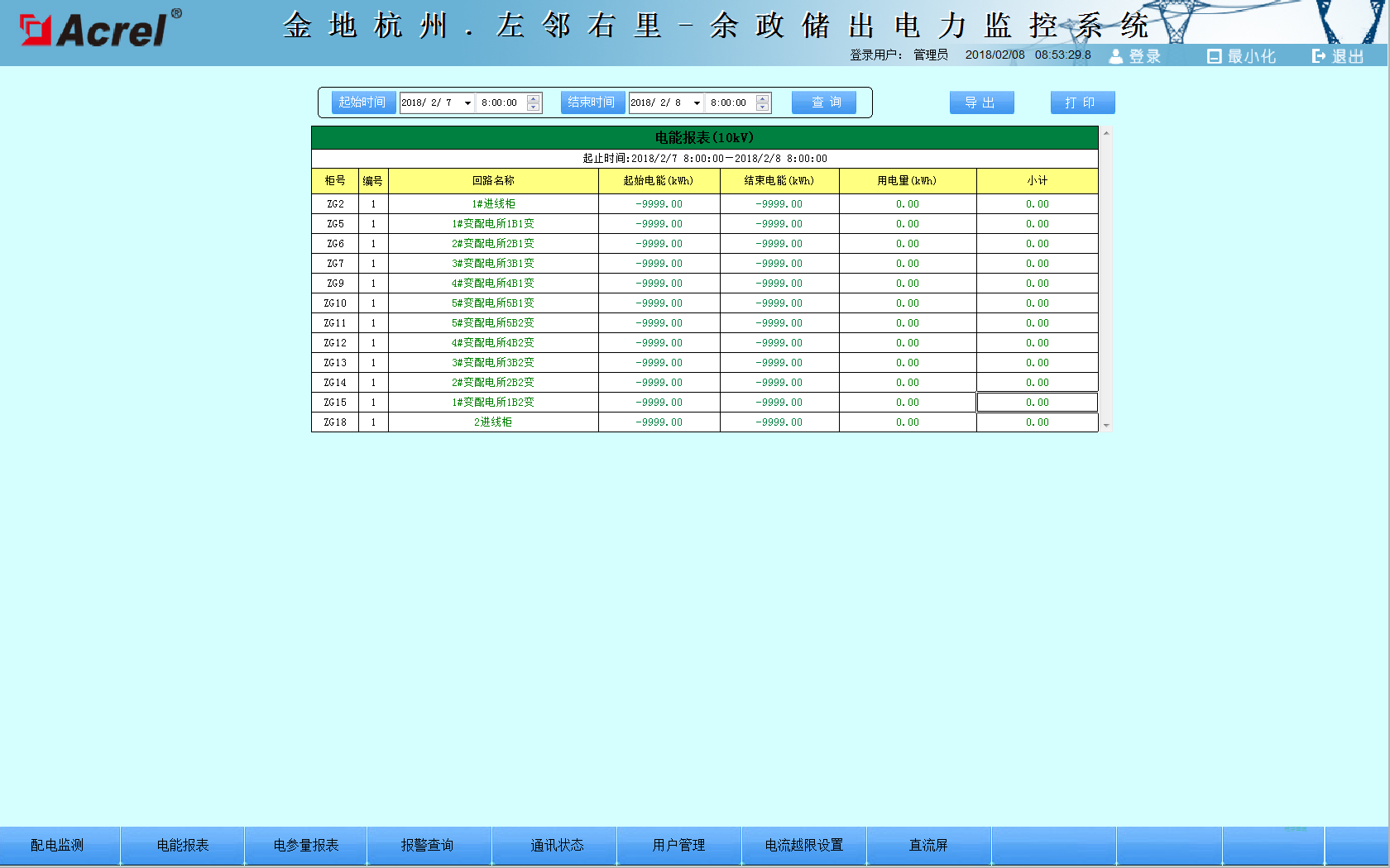主要功能:具有起始時間和結(jié)束時間的時間選擇框,選定想要查詢的時間段后,通過點擊查詢按鈕可查詢出系統(tǒng)項目范圍內(nèi)所有配電回路的用電量。可通過導(dǎo)出按鈕將報表以Excel形式導(dǎo)出保存,通過打印按鈕進行報表打印。