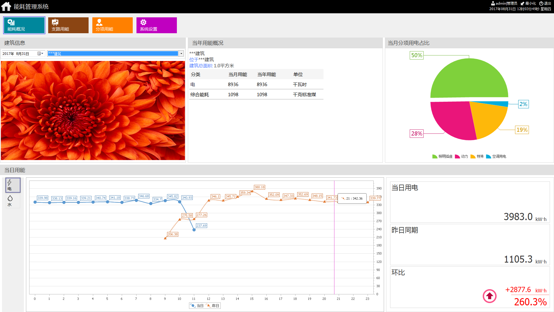 通過綜合能耗主界面可以反映建筑物當年用能各分類能耗和折算為標準煤的綜合能耗,并計算得到單位面積能耗;界面下方顯示這能耗的當日逐時用能曲線;單擊每個分類能耗的上部區(qū)域,可跳轉到該分類能耗的用能分析主界面;可通過下拉框切換建筑物。