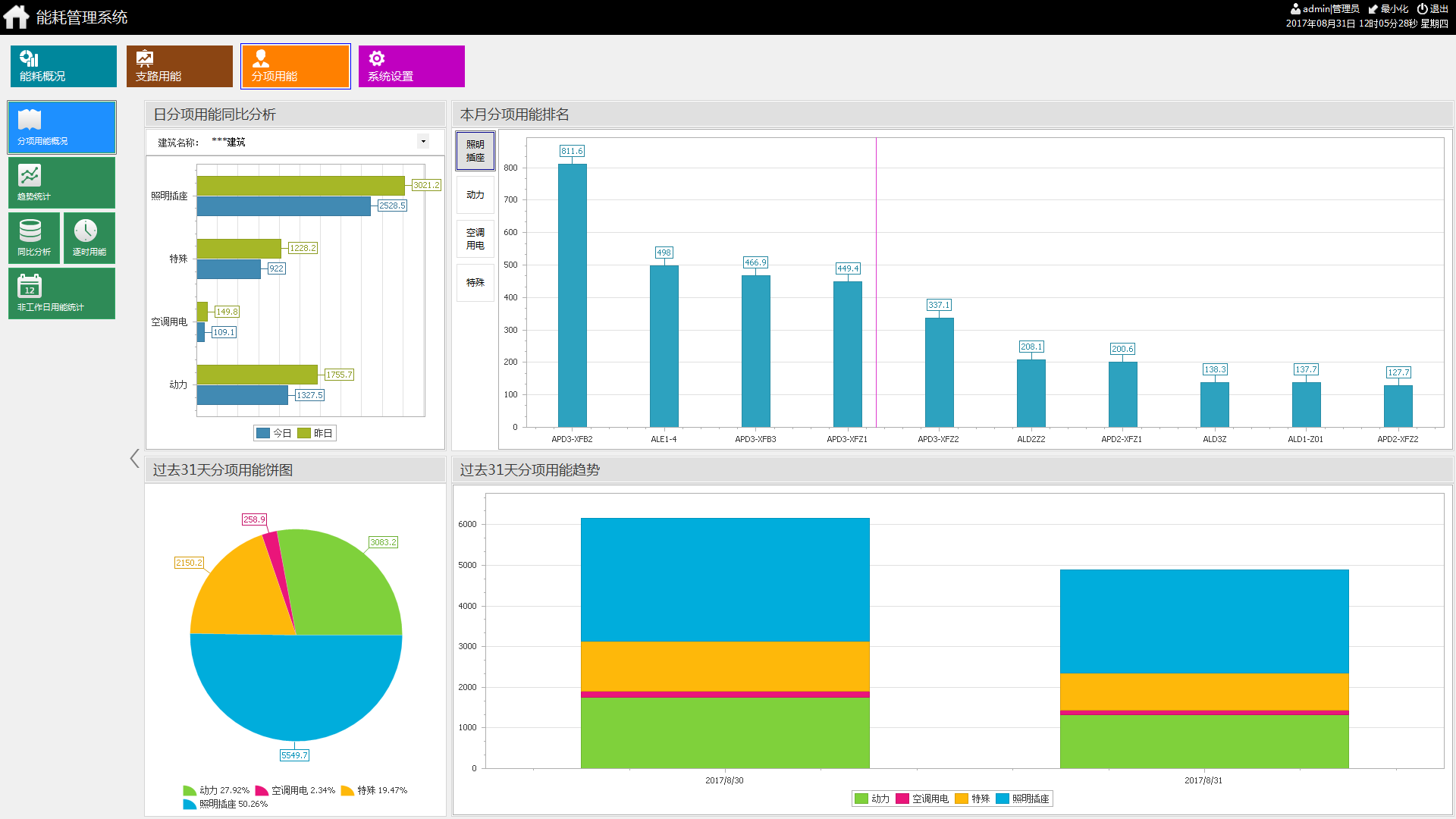 將數(shù)據庫中的能耗數(shù)據進行多維分析和鉆取,利用目前主流的數(shù)據圖形化展示組件,以圖表形式直觀反映和對比各項能耗數(shù)據,并統(tǒng)計能耗數(shù)據的數(shù)值、趨勢和分布情況。圖表展示方式包括:餅圖、柱狀圖、堆積圖、線圖、面積圖、儀表盤等。
